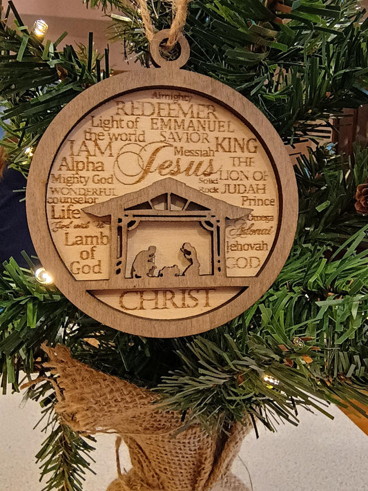 Nativity Christmas Ornament with Names of God Laser Engraved Wooden Nativity Ornament Layered Wooden Nativity Ornament Manger Scene Ornament